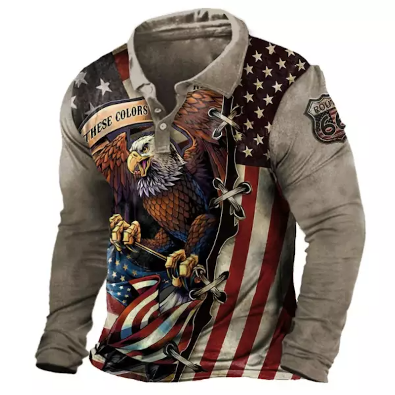 Men's Route 66 American Eagle Print Long Sleeve Polo Shirt