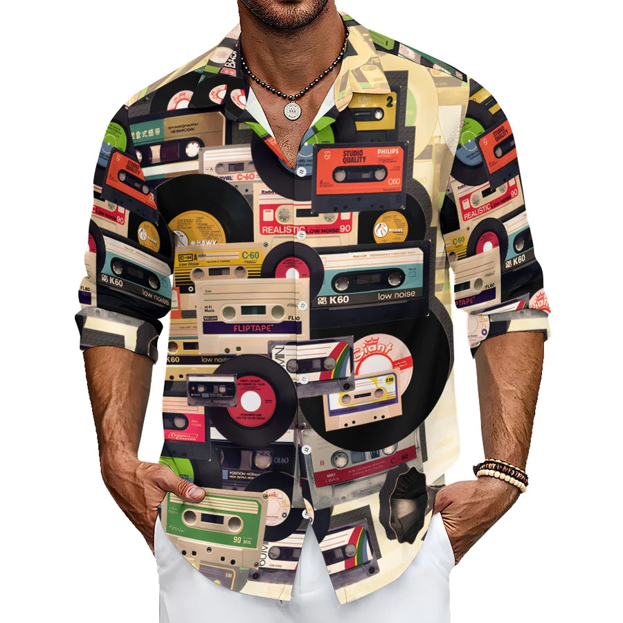 Casual Music Tape Vinyl Record Printed Long Sleeve Shirt