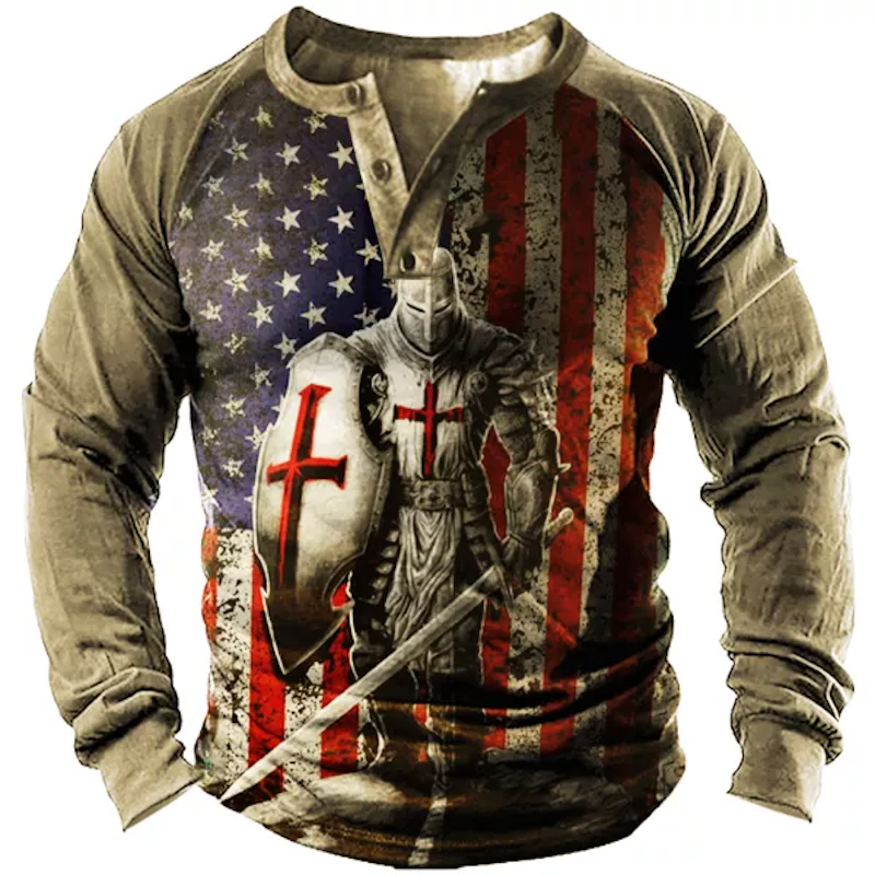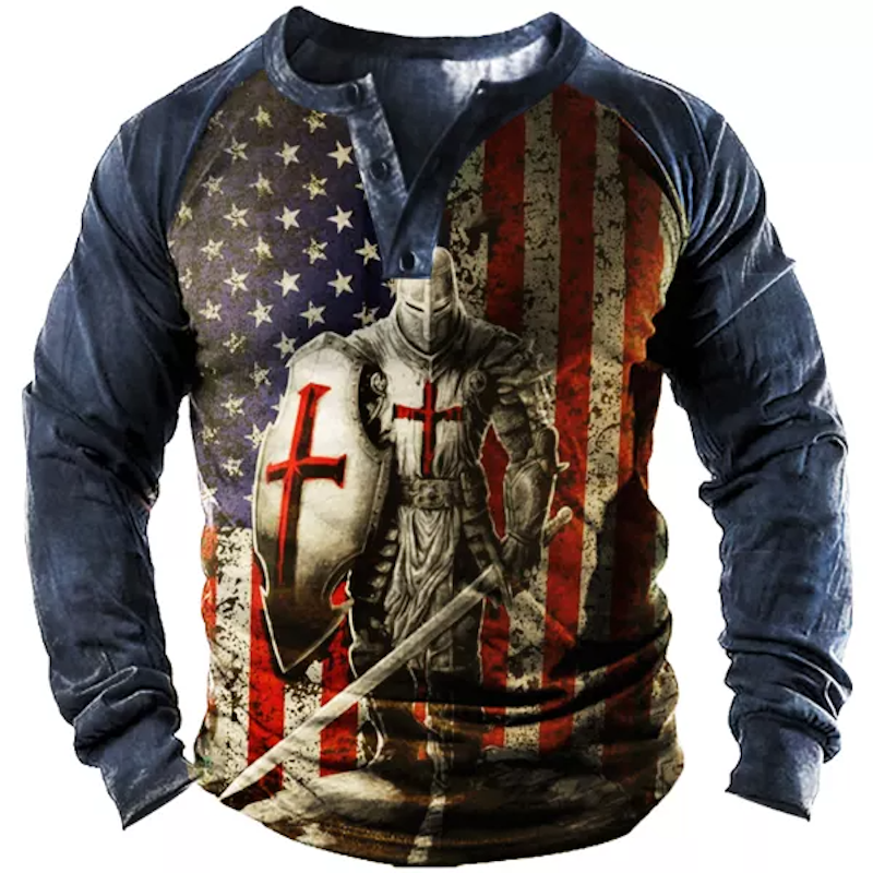 This American Knight Cross Print Henley Men's T-Shirt is an essential piece for any man's wardrobe. Featuring a classic collar, this shirt is enhanced by the American-inspired print and cotton blend material. With a long sleeve, it makes for an everyday or casual outfit that can be dressed up or down.