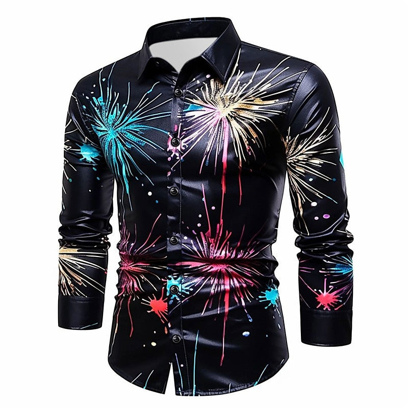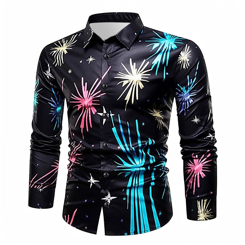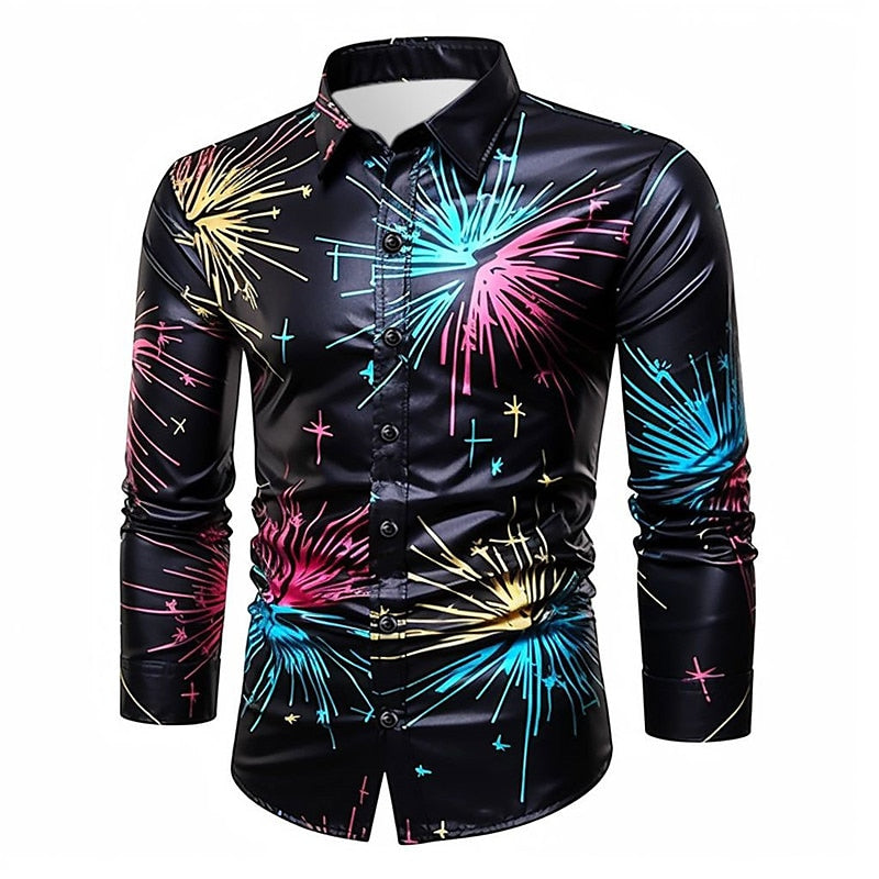 Celebrate any festive occasion with this Button Up Shirt With Vibrant Firework Pattern adorned with a vibrant firework pattern. The crisp tailoring and festive design offer a unique blend of elegance and spirited flair, suitable for events or as a standout piece in your wardrobe. Upgrade your outfit today!