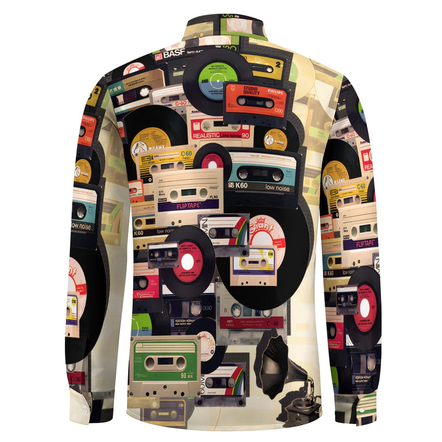 Casual Music Tape Vinyl Record Printed Long Sleeve Shirt