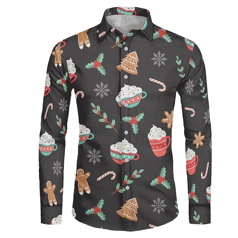 Indulge in the sweetness of the holiday spirit with our Gingerbread And Snowflake Print Shirt. This charming button-up features a delicious array of festive treats and symbols scattered across a deep charcoal background. This shirt is not just a garment, it's a piece of the holiday joy you can wear.