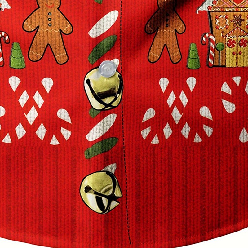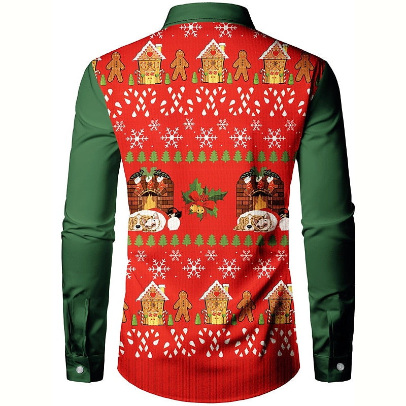 The Gingerbread Christmas-Themed Turndown Printed Shirt is a festive addition to the holiday wardrobe. This vibrant shirt features classic Christmas motifs such as gingerbread men, houses, and snowflakes, set against a rich red background.