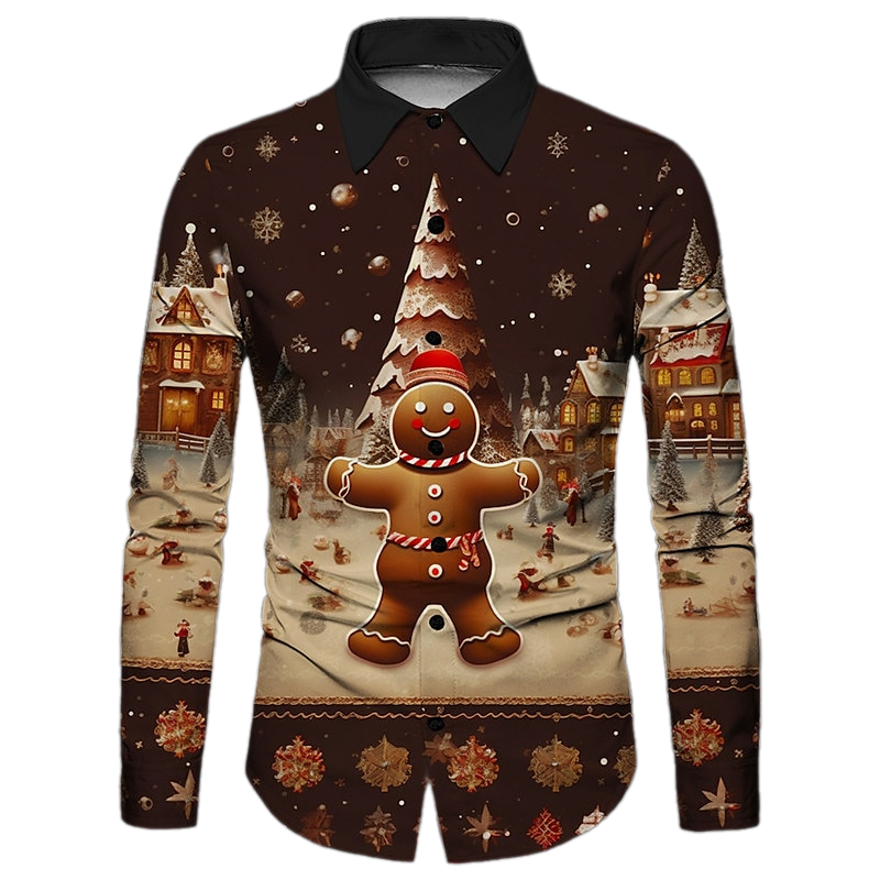 Embrace the spirit of Christmas with this Gingerbread Town Holiday Printed Shirt. Decorated with a fun and whimsical gingerbread man pattern, this shirt is perfect for adding a playful twist to your holiday wardrobe. The fabric is soft and comfortable, making it a great choice for all-day wear during the holiday season. The turndown collar and long sleeves provide a smart and stylish look, perfect for any casual holiday event.