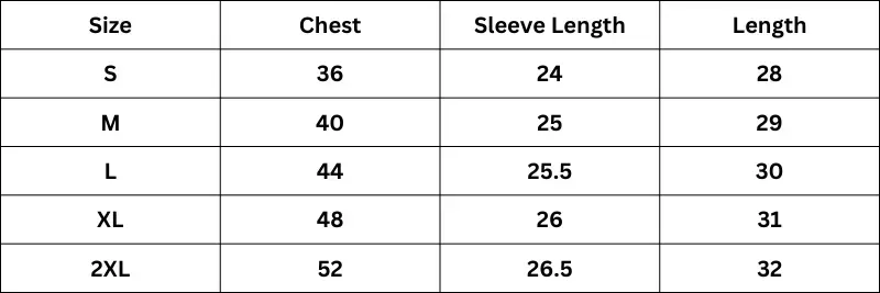 Size Chart (Inches):
