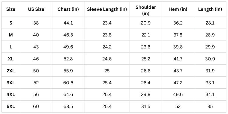 Size Chart (Inches):