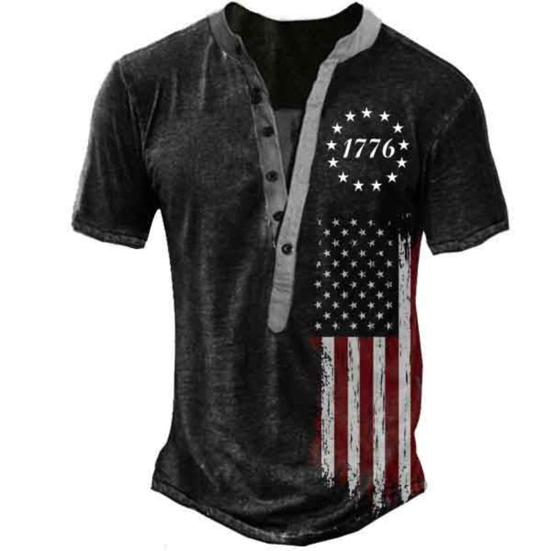 Our Men's 1776 American Flag Henley Short Sleeve T-Shirt is ready for your relaxing day at home or out on the town. The cotton blend fabric is lightweight and breathable, making it perfect for summer days. White stitching and a frayed hem add a vintage feel to this modern tee.