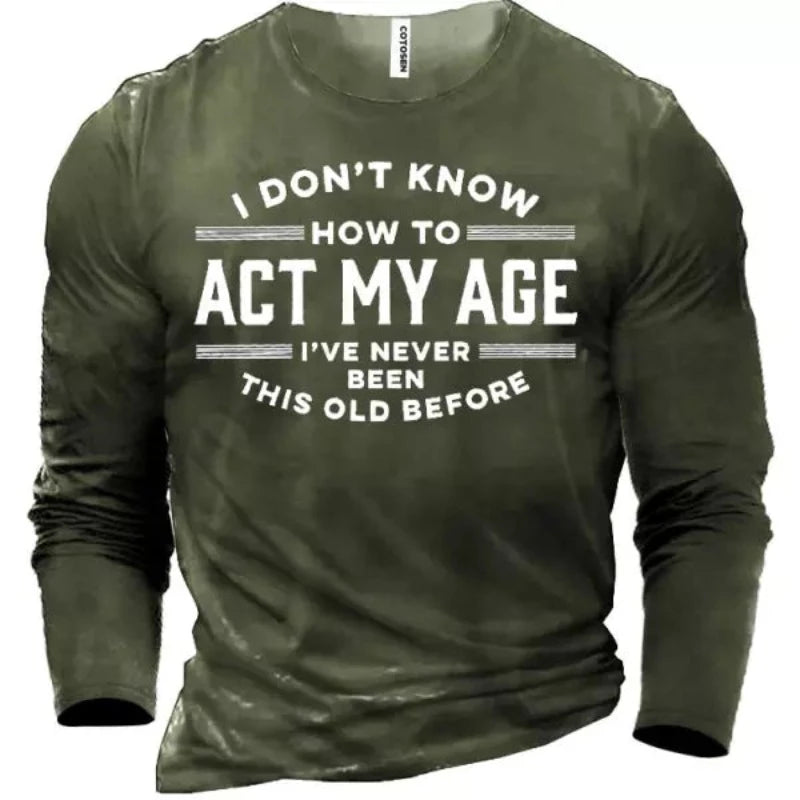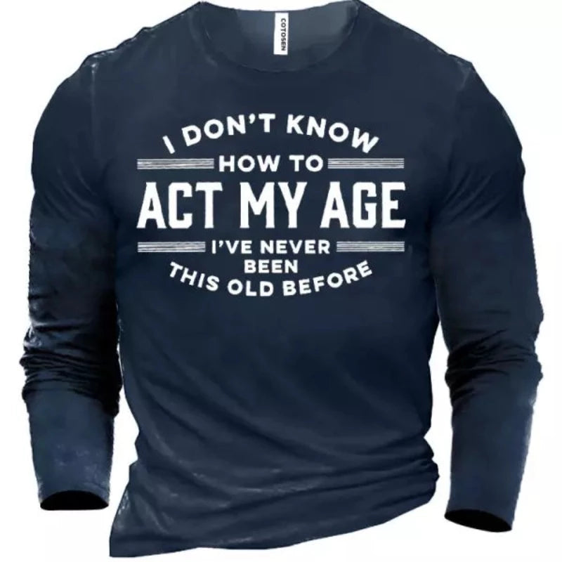 This Men's Act My Age T-Shirt is made up of pure cotton that is very comfortable. Pair this T-shirt with your favorite jeans, trouser, and joggers. This t-shirt is ideal for the gym, casual outings, and daily morning and night walks. The sleeve length in this T-shirt is long sleeve. It comes in four different colors Green, Gray, Blue, and Black.