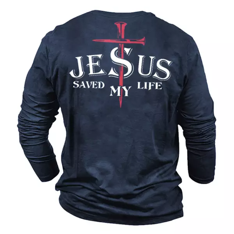 Our men's comfortable Jesus Saved My Life printed cotton T-shirts are a must-have for any man of faith. This T-shirt is made from 100% cotton for a soft, comfortable feel. The shirt features a round neckline and long sleeves. The front of the shirt is printed with the words "Jesus Saved My Life" in a bold, black font.