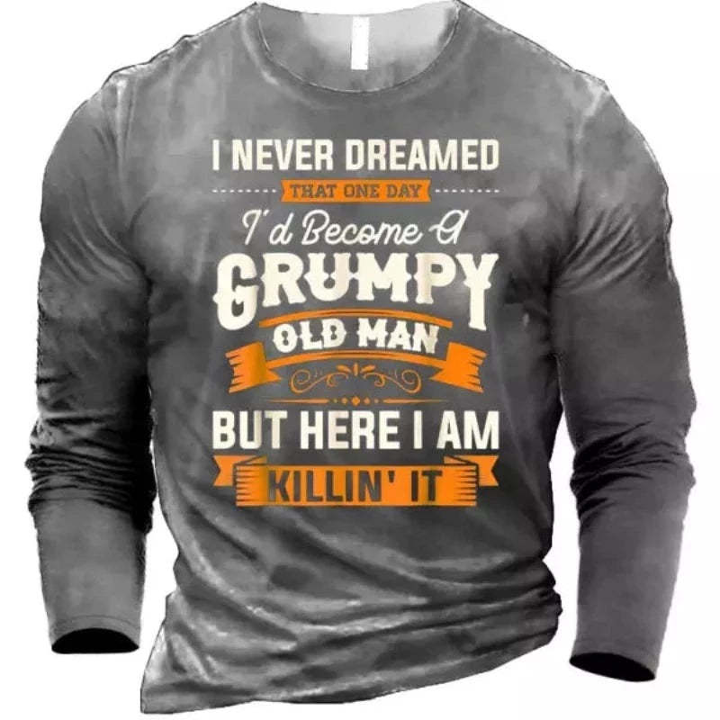 Men's Grumpy Old Man Long Sleeve T-Shirt has been a classic since the beginning of time. This teal-colored 'Old Man' shirt is constructed of high-quality cotton. This t-shirt's fabric and structure make it exceptionally comfortable while also providing outstanding durability. It's excellent for casual wear, with a standard fit and long sleeves. It is Ideal for wearing both in the summer and winter.