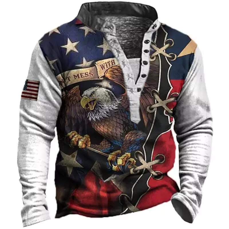 This is a men's vintage American Eagle long-sleeve sweatshirt. It is made of polyester and has a button closure at the neckline. The design elements include a print design.