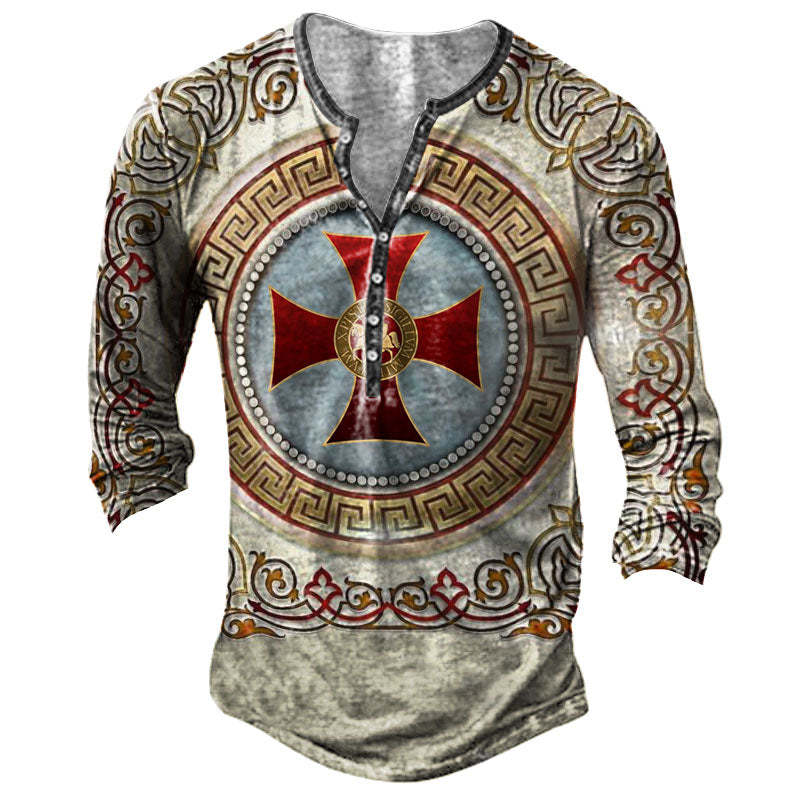 Men's Vintage Knights Templar Cross Henley Long Sleeve T-Shirt is made of high-quality polyester fabric. It boasts a button closure and half-placket. The henley design can easily be worn alone or layered under a jacket to add style and comfort to your daily life.