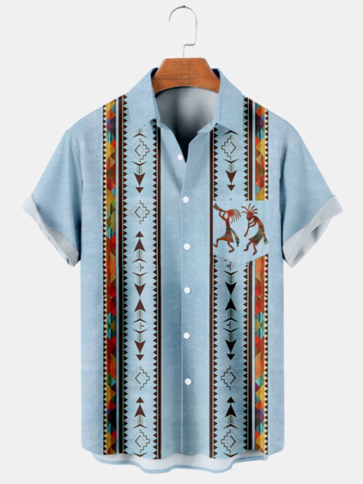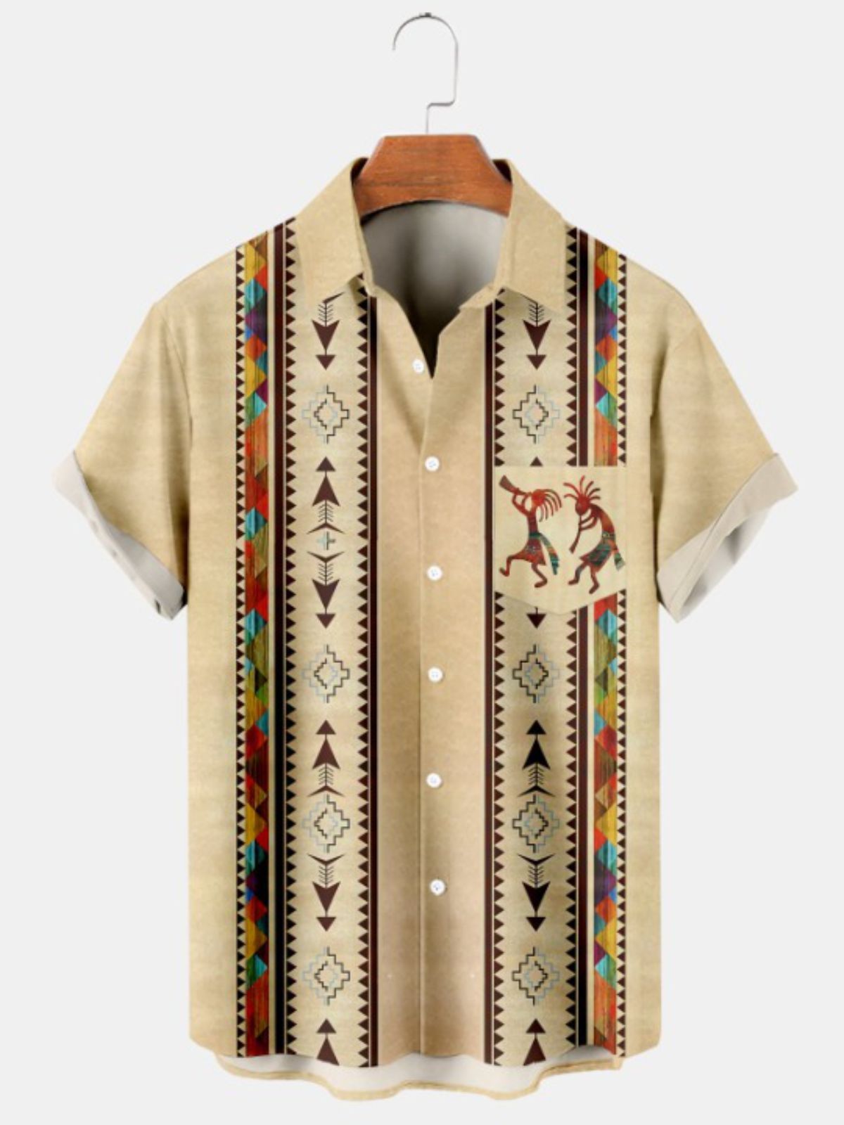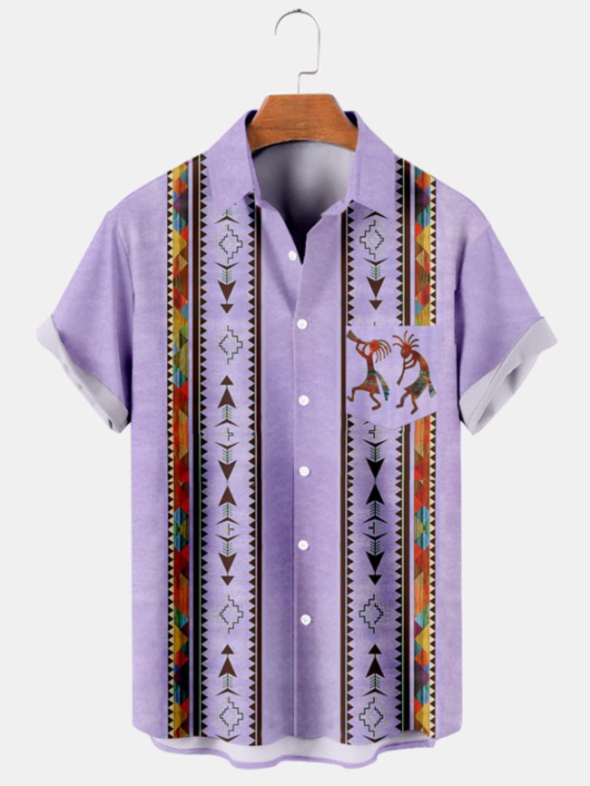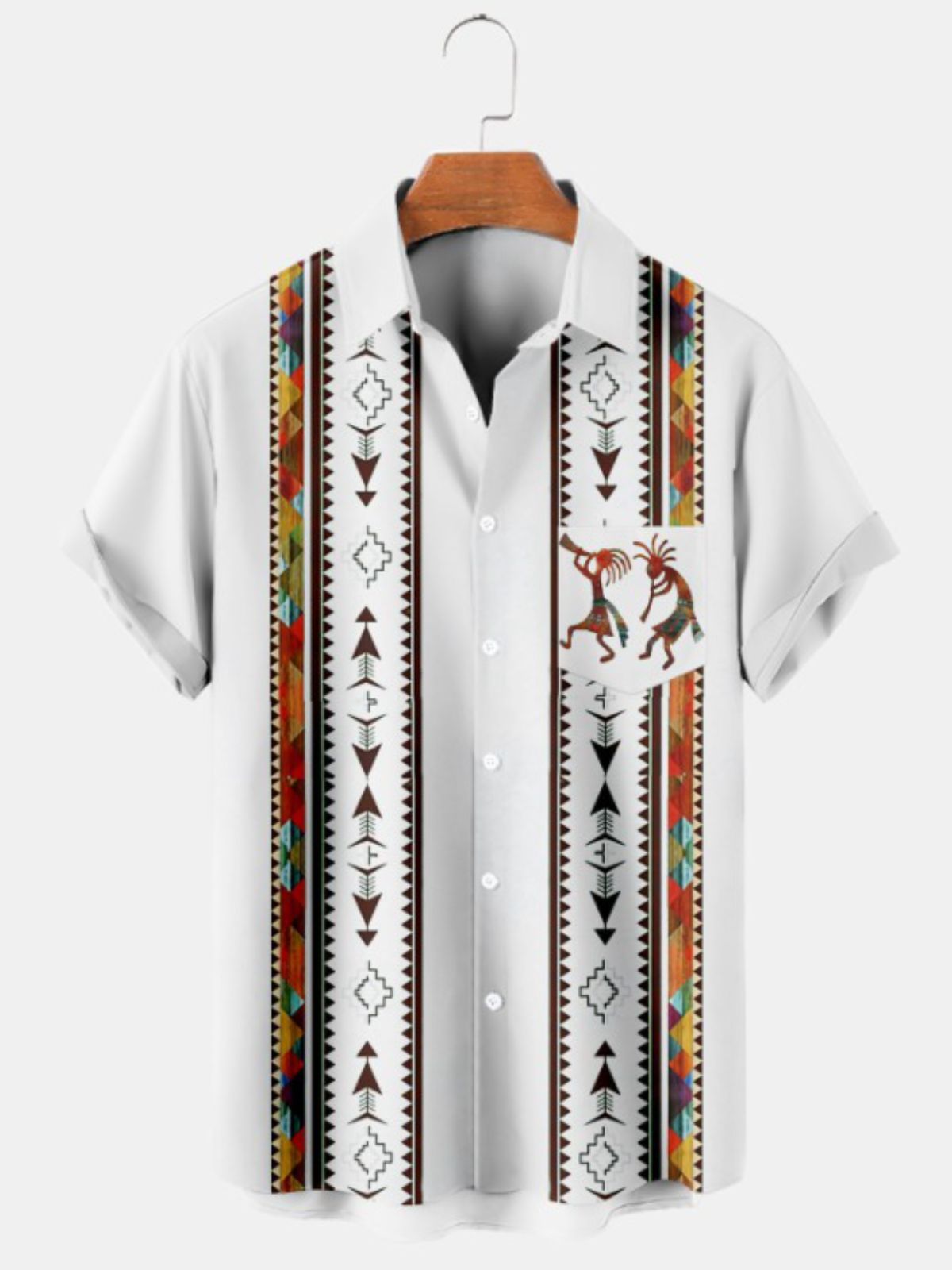 Make a cultural statement with our Native American Print Short Sleeve Shirt. The striking Cowboy and Kokopelli patterns celebrate the rich history of Native American culture. Crafted from non-stretchy fabric and designed with short sleeves, this shirt offers both comfort and authenticity. Embrace the spirit of the Southwest and showcase your unique sense of style.