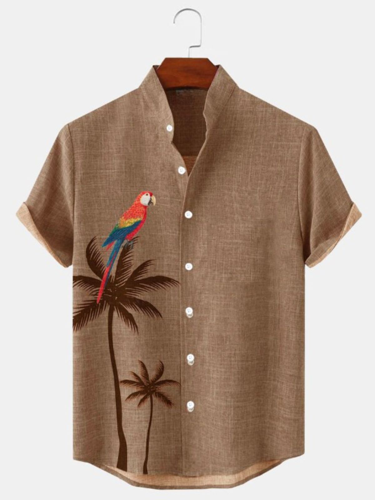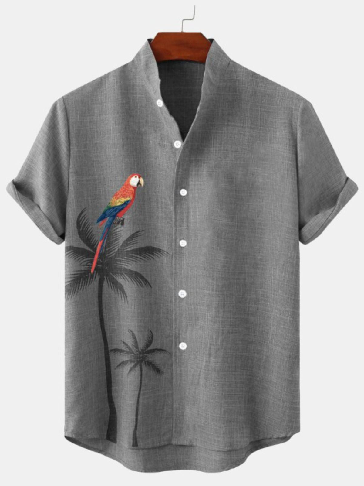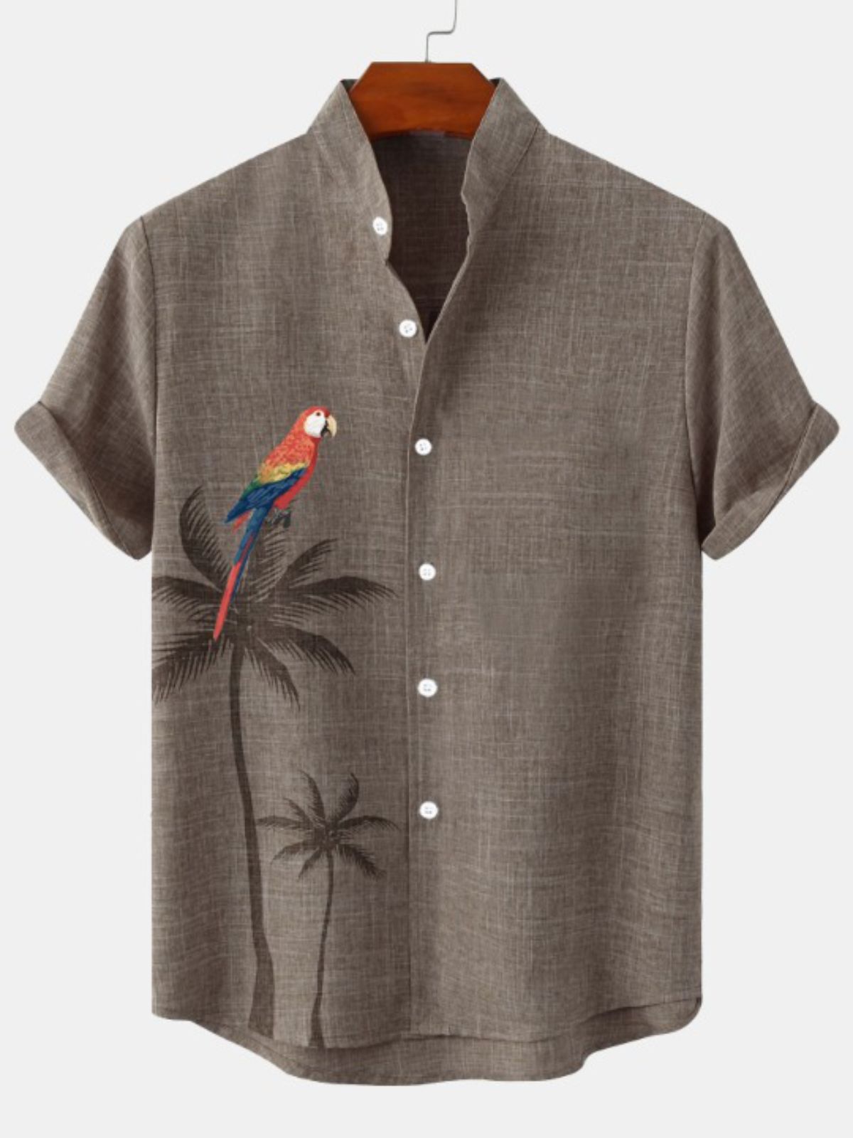 Embrace tropical vibes with our Palm Tree Parrot Print Short Sleeve Shirt. This shirt's vibrant parrot and palm tree pattern will transport you to a beachy paradise. Crafted with non-stretchy fabric, it offers a classic fit for ultimate comfort. Perfect for your next vacation or a casual day out, this shirt brings the spirit of Thanksgiving to your wardrobe.