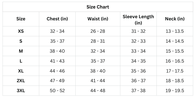 Size Chart (Inches):