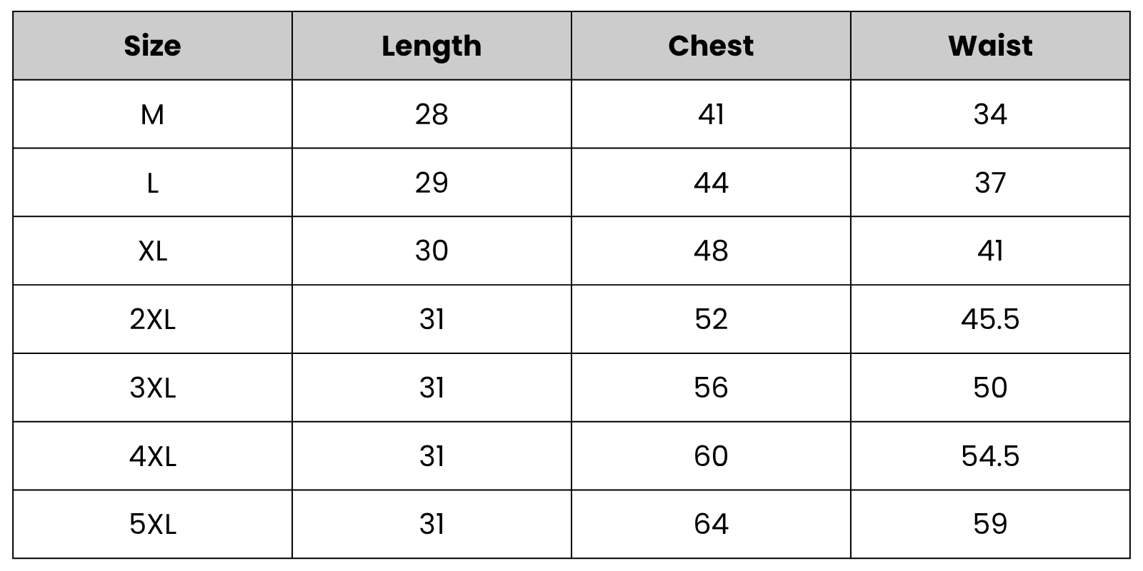 • Sizes: M, L, XL, 2XL, 3XL, 4XL, 5XL