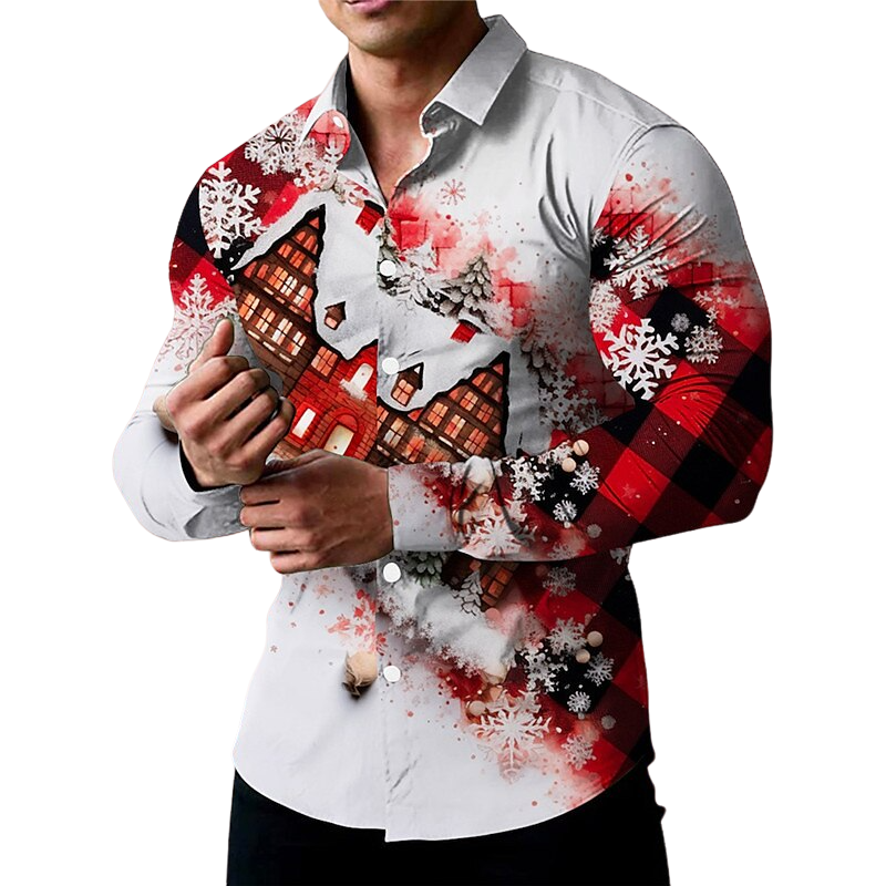 Introducing our Snowflake House Shirt, a must-have addition to your winter wardrobe. This shirt showcases a charming pattern that combines quaint houses with intricate snowflakes, evoking a sense of holiday nostalgia. Whether you're sipping hot cocoa or enjoying a snowy day outdoors, this shirt's casual style and seasonal pattern make it a perfect choice for fall and winter.