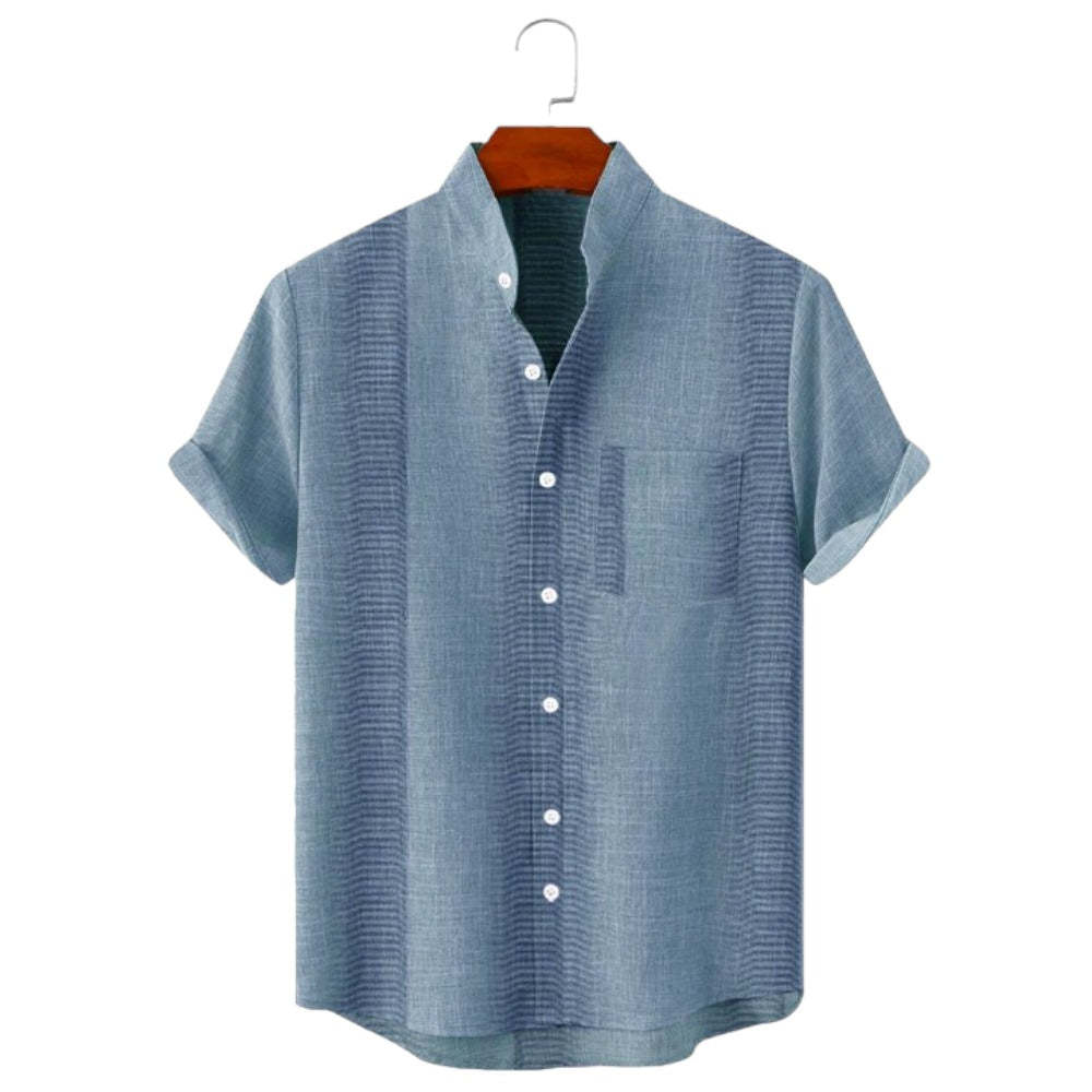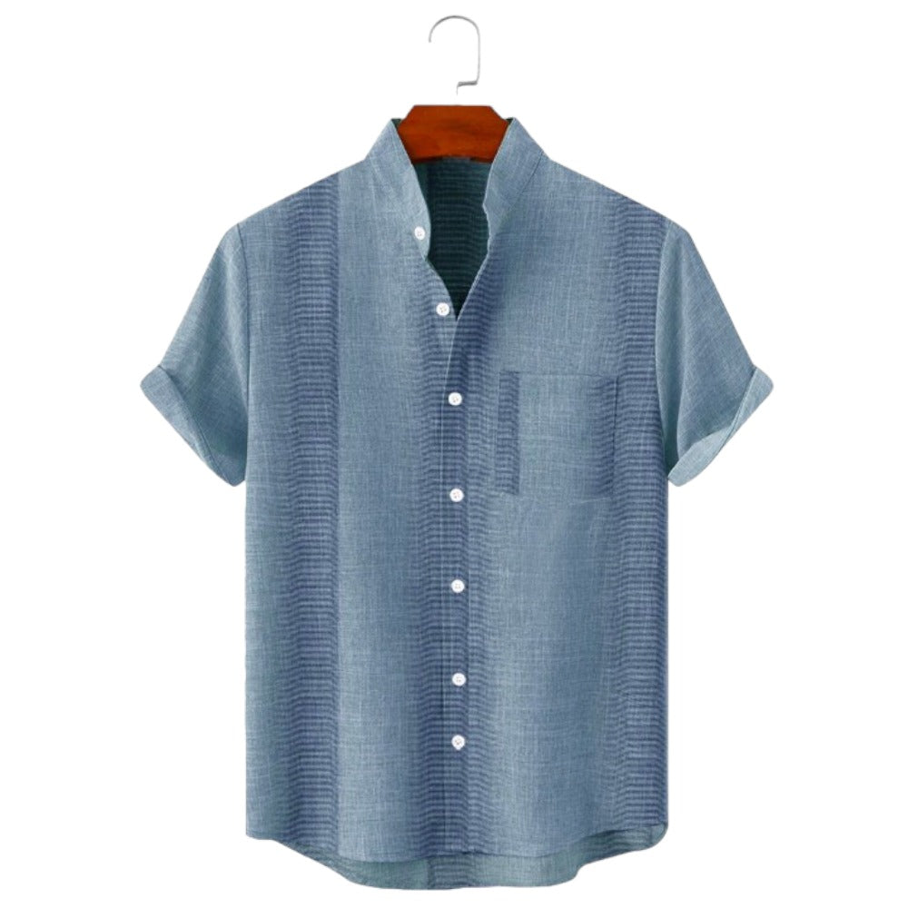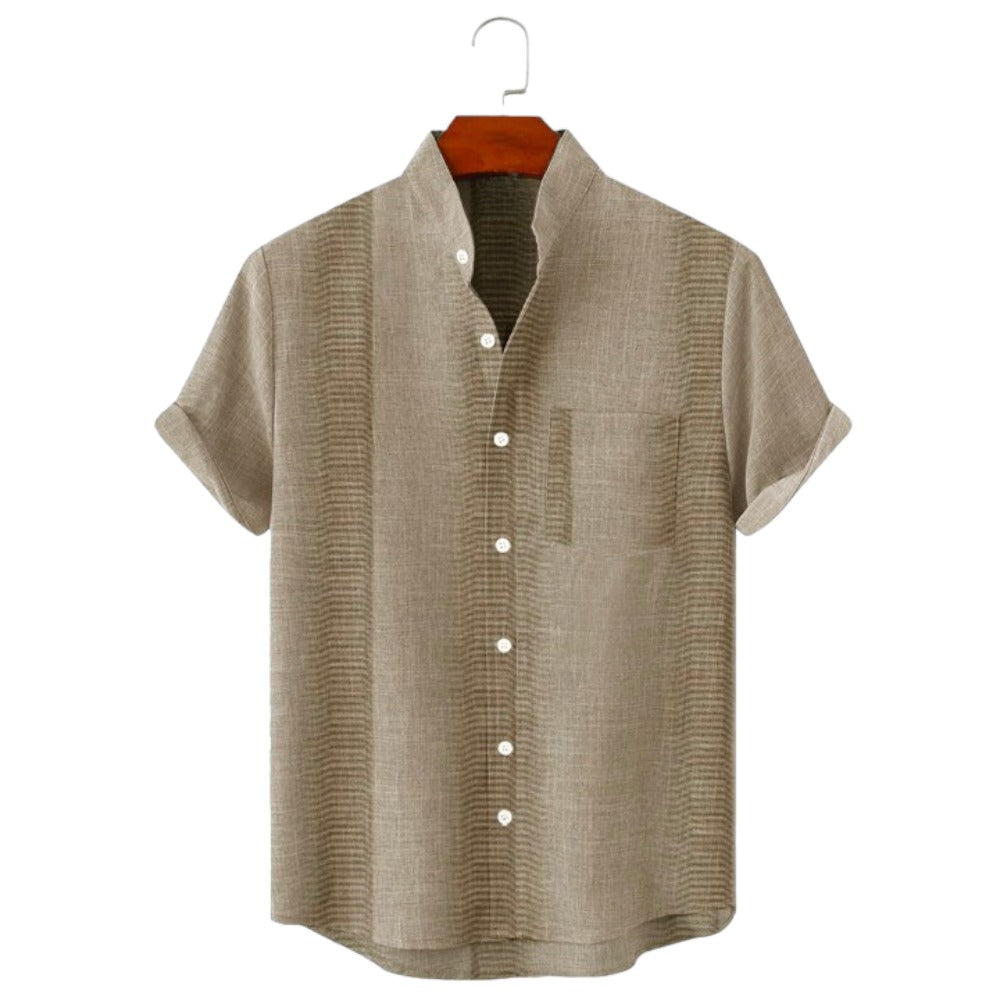 Discover timeless elegance with our Stand Collar Striped Short Sleeve Shirt. Boasting a classic stand collar and a non-stretchy fabric, it ensures both comfort and sophistication. Its understated Hawaiian-inspired pattern adds a touch of charm to your ensemble. The fusion of a simple pattern and short sleeves makes it an ideal choice for any occasion.