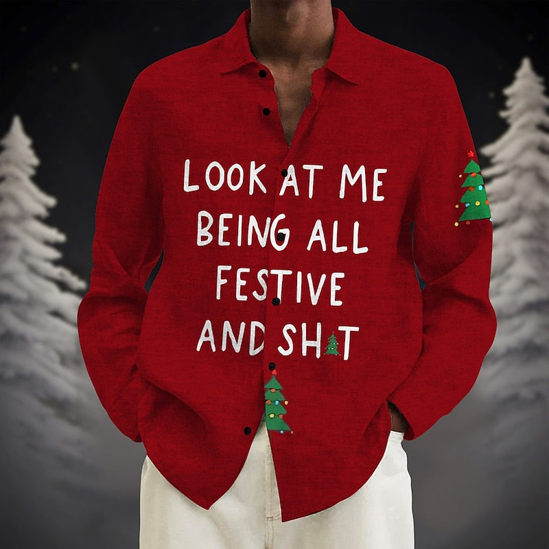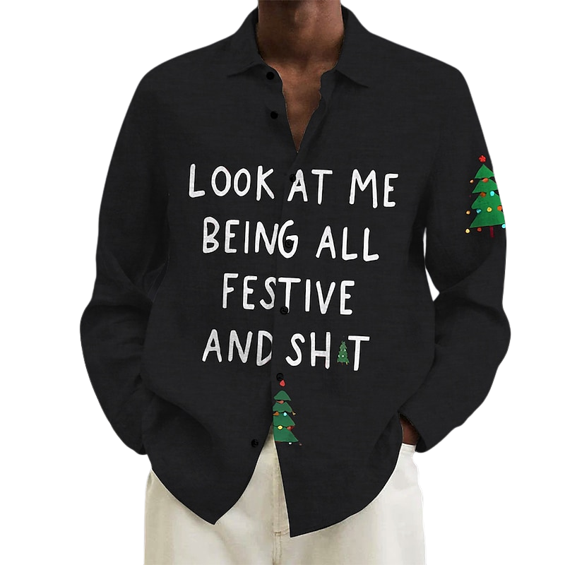 Enhance your casual collection with our Text and Christmas Tree Printed Shirt. Tailored from slub fabric, this long-sleeved linen shirt features a turndown neckline and micro-elastic fabric for comfort. The button-down design and a modish quote make it a stylish choice, blending festive charm with a casual aesthetic.