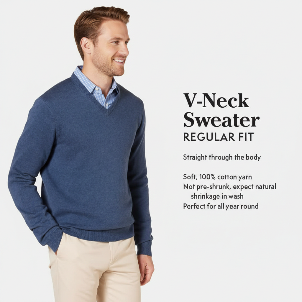 The V Style Cotton Pullover is designed to simplify outfit planning with a classic silhouette and natural-fiber knit. The V-style opening creates a clean outline that pairs well with casual bottoms and also works with more structured pieces. Its regular fit provides an easy shape through the torso, making it comfortable for routine wear and suitable for layering. Ribbed finishing adds structure at key edges, helping the sweater sit neatly at the cuffs and hem.