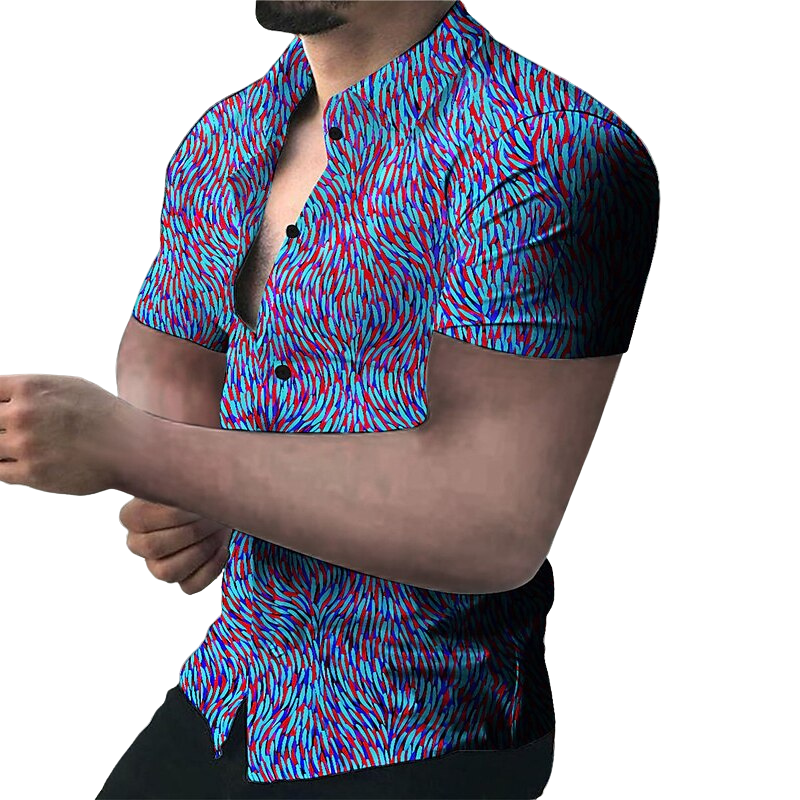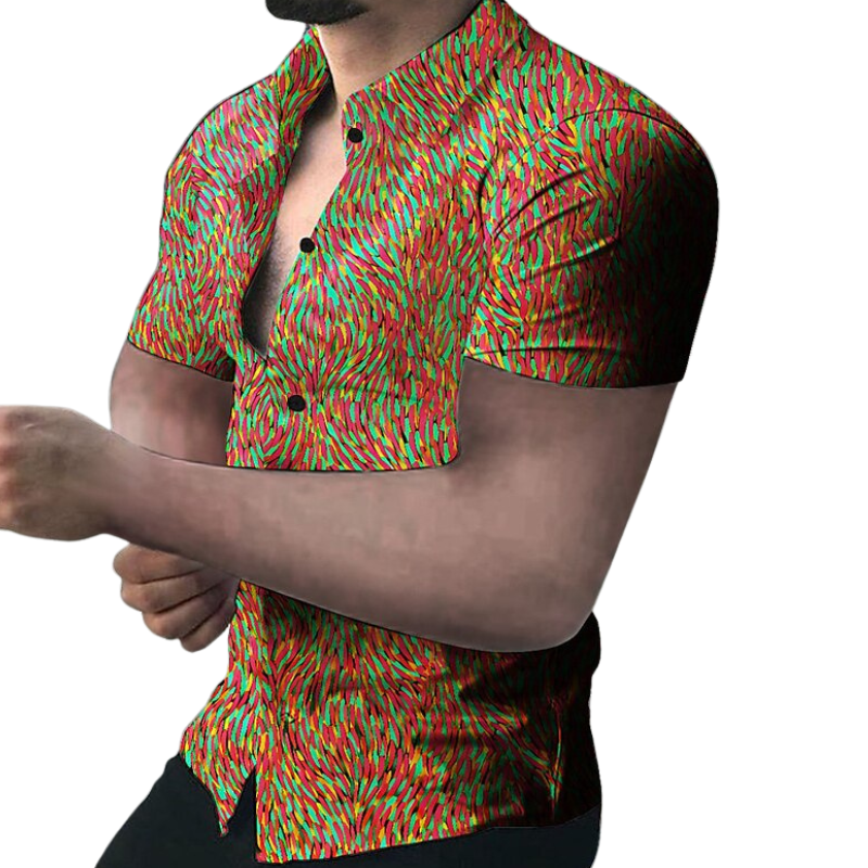 Ignite your wardrobe with our Vibrant Print Pattern Shirt. This shirt makes a sizzling statement with its fiery print pattern, bursting with bright reds and greens that mimic the dance of flames. Its modern, body-accentuating cut pairs with the short sleeves to create a bold, summer-ready look!